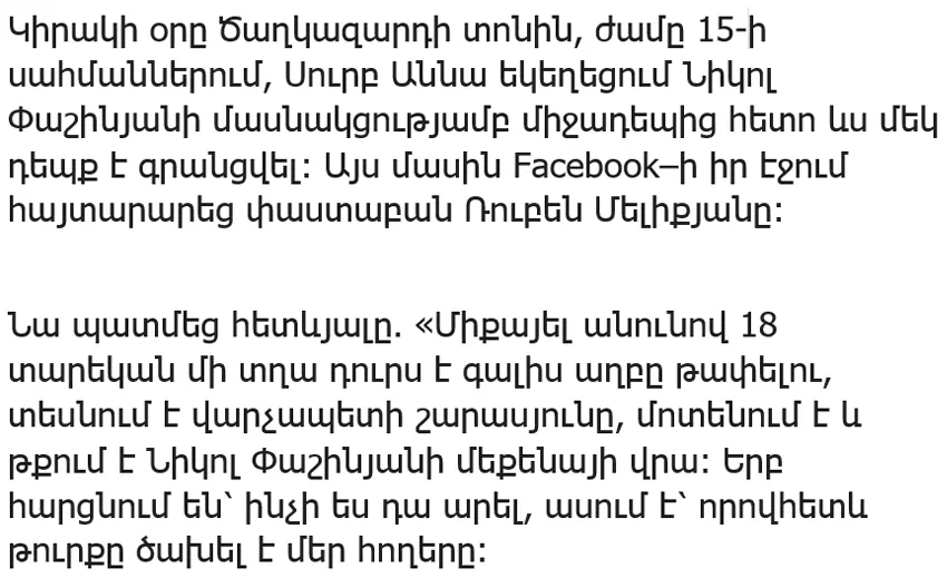 On Palm Sunday, at around 3 p.m., another incident was recorded at the St. Anna Church with Nikol Pashinyan. Lawyer Ruben Melikyan announced this on his Facebook page.