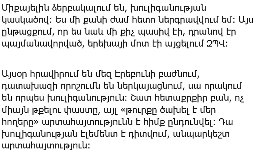 Today they invite us to the Erebuni department, they present the prosecutor’s decision, they qualify this as hooliganism. It is very interesting that not only the fact of spitting, but also the phrase “the Turk sold our lands” was taken as a basis. It is considered an element of hooliganism, an obscene expression.
