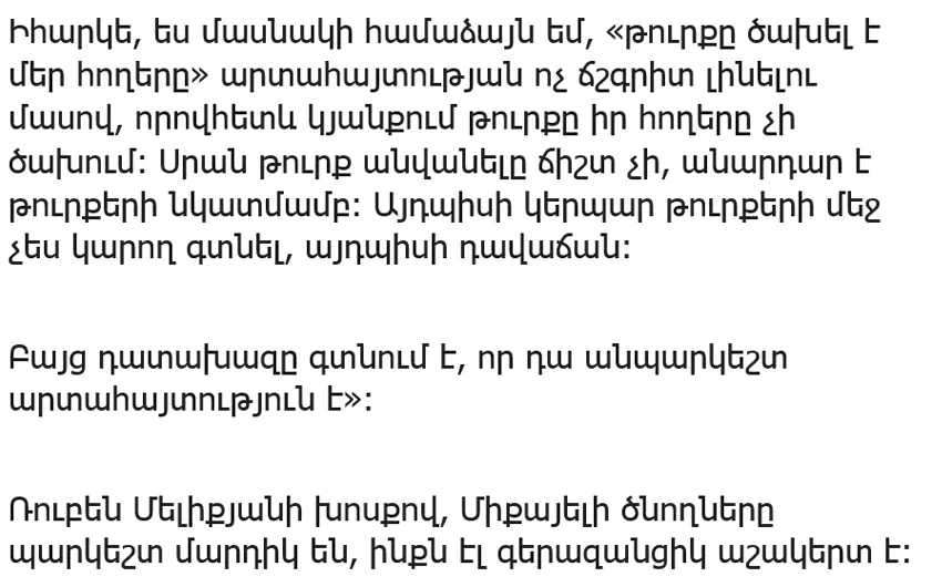 Of course, I partially agree with the inaccuracy of the expression “the Turk sold our lands”, because in life the Turk does not sell his lands. Calling him a Turk is not right, it is unfair to the Turks. You cannot find such a character among the Turks, such a traitor.