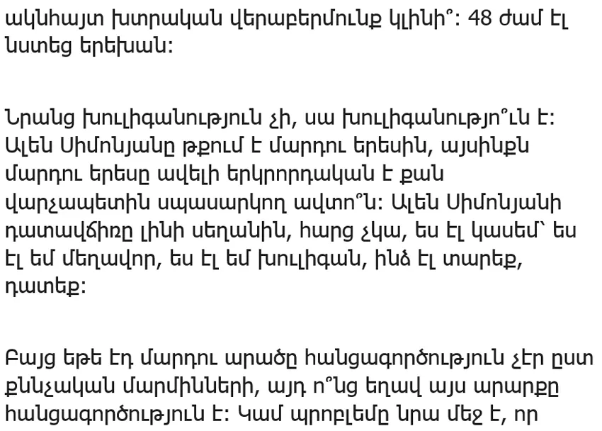 If they brought Alen Simonyan’s guilty verdict and put it on the table, I would accept it, I would say, “Oh, I’m also being accused here, but what country is this?” In other words, Alen Simonyan spitting in a person’s face is not a crime, the child who expressed his position in that not very polite way, is that a crime? How can that be? Would that be obvious discriminatory treatment? The child sat for 48 hours.