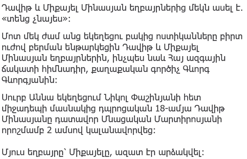 About an hour later, police officers from the church yard brutally detained the brothers Davit and Mikael Minasyan, as well as the founder of the Armenian National Front, politician Gevorg Gevorgyan.