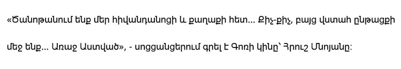 “We are getting to know our hospital and the city… Little by little, but we are on a confident path… God forbid,” Gor’s wife, Hrush Mnoyan, wrote on social networks.